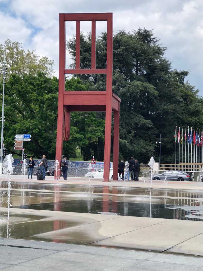 This is a site-specific sculpture in Geneva, Switzerland, it is situated right in front of United Nations of Geneva. The piece was erected on August 18st in 1997 by Handicap International. It was built to support the treaty against and banning of Cluster Bombs (landmines). I am very familiar with this piece, and it’s message is very powerful and beautiful.
