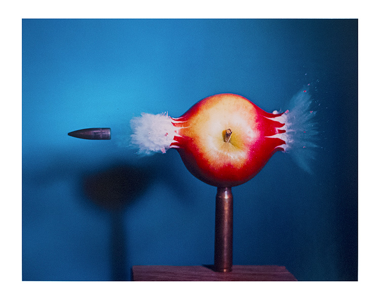 This image perfectly captivates the exam moment the apple was impacted by the bullet, you can see pieces of the apple coming off the apple and being teared, and the juices exploding out of the apple, because of the perfect timing that the image was captured. This images shows movement of the bullet going through the apple and out the other side.